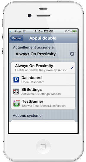 Une fois le tweak Always On Proximity installé, il n’y a pas de nouvelle icône ajoutée sur votre Springboard, ni d’option pour le configurer dans les réglages de votre iDevice. Il faudra simplement lui assigner une commande Activator. Je vous recommande une commande disponible et accessible « Partout » pour que vous puissiez activer ou non le capteur de proximité sur le Springboard, le LockScreen ou plus utile, dans une application.
