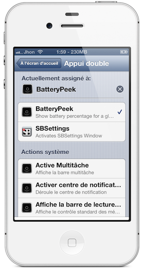 Disponible gratuitement sur Cydia sur la source BigBoss, l’addon BatteryPeek permet en effet d’afficher le niveau de batterie (en %) dans la StatusBar succinctement lorsque vous effectuerez une commande Activator. Une fois celui-ci installé, il n’y a pas de nouvelle icône ajoutée sur votre Springboard, ni d’option pour le configurer.