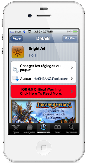 Disponible gratuitement sur Cydia sur la source BigBoss, le tweak BrightVol permet donc d’ajuster facilement la luminosité de votre iDevice via les boutons physiques de volume. Une fois le tweak BrightVol installé, il n’y a pas de nouvelle icône ajoutée sur votre Springboard, ni d’option pour le configurer dans les réglages de votre iDevice.