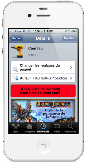 Disponible gratuitement sur Cydia sur la source BigBoss, le tweak CamTap permet en effet de simplifier le LockScreen de votre iDevice en offrant une seule et unique icône pour déverrouiller votre iDevice et ouvrir l’appareil photo. Une fois le tweak CamTap installé, il n’y a pas de nouvelle icône ajoutée sur votre Springboard, ni d’option pour le configurer dans les réglages de votre iDevice. Il faudra le désinstaller sur Cydia pour qu’il cesse de fonctionner.