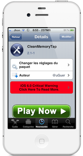 Disponible gratuitement sur Cydia sur la source BigBoss, l’application CleanMemoryTap permettra d’optimiser* un peu les performances de votre appareil (*légèrement). Une fois celle-ci installé, vous disposerez d’une nouvelle icône sur votre Springboard pour accéder aux fonctions de l’application.