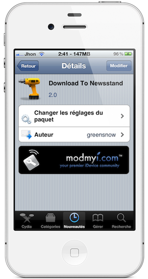 Une fois le tweak Download To Newsstand installé, il n’y a pas de nouvelle icône ajoutée sur votre Springboard, ni d’option pour le configurer dans les réglages de votre iDevice. Il faudra malheureusement désinstaller le tweak Download To Newsstand sur Cydia pour qu’il cesse de fonctionner.