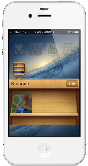 Avec le tweak Download To Newsstand, vous verrez maintenant les applications que vous téléchargez s’afficher dans l’icône du kiosque ainsi que sur l’interface de celui-ci (avec de grandes icônes). Une fois l’application AppStore téléchargée et installée, celle-ci est supprimée du kiosque (seules les apps en cours de téléchargement et d’installation seront affichées dans le kiosque).