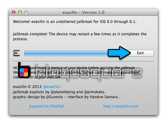 Patientez jusqu’à obtenir le message final « jailbreak complet! » et cliquez sur « Exit » pour fermer Evasi0n.