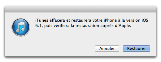 – Restauration sous l’iOS 6.1 sur iTunes (juste en cliquant sur Restaurer).