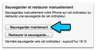 Sauvegardez les contenu de votre appareil sur iTunes. Pour cela, rendez vous dans l’onglet de gestion de l’iDevice sur iTunes et cliquez simplement sur « Sauvegarder maintenant ».