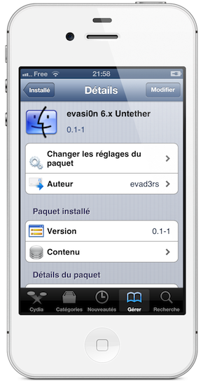 Une fois le paquet evasi0n 6.x Untether installé, il n’y a pas de nouvelle icône ajoutée sur votre Springboard, ni d’option pour le configurer. Tout comme le paquet Rocky Racoon 5.1.1, je vous conseille de le désinstaller avant restauration de votre appareil.
