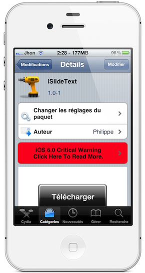 Une fois celui-ci installé, il n’y a pas de nouvelle icône ajoutée sur votre Springboard, ni d’option pour le configurer dans les réglages de votre iDevice. Il faudra le désinstaller sur Cydia pour qu’il cesse de fonctionner. Je vous conseille de remettre le texte de base avant de le supprimer sur Cydia (Déverrouiller).