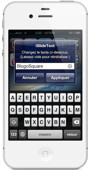 Pour modifier le texte, c’est vraiment très simple. Il suffit de faire un appuie double sur le slider de déverrouillage sur le LockScreen. Une PopUp et le clavier apparaissent alors. Cliquez sur « Appliquer » pour que le texte que vous avez saisi remplace le texte d’origine (sans respring, juste un retour au LockScreen) ou « Annuler » pour le conserver.