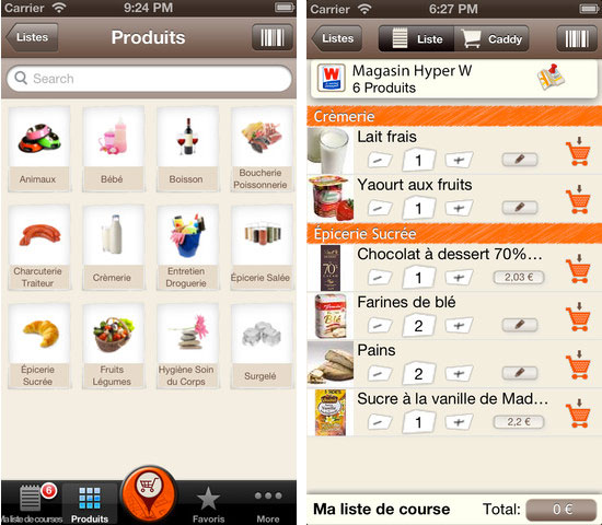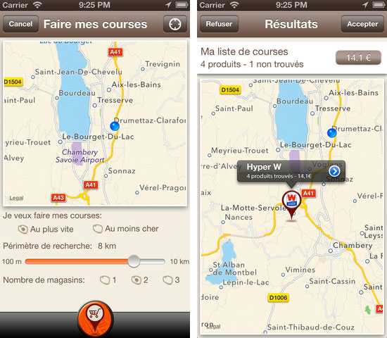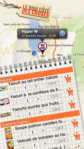 Grâce à la géo-localisation et à partir de la liste de courses, l’application permet de comparer les produits sélectionnés et propose trois solutions : plus rapide, moins cher et le minimum de magasins différents.
