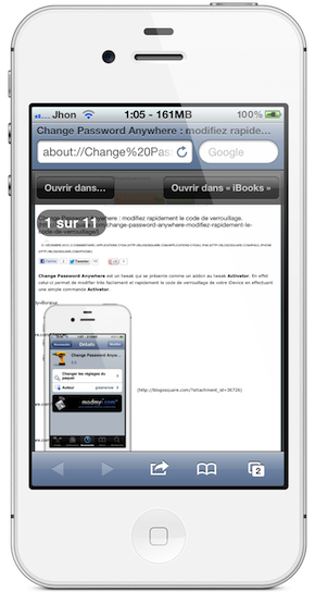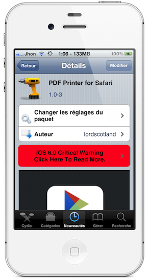 Disponible gratuitement sur Cydia sur la source BigBoss, le tweak PDF Printer for Safari permettra en effet de convertir les pages internet que vous voulez imprimer. Une fois celui-ci installé, il n’y a pas de nouvelle icône ajoutée sur votre Springboard et ni d’option pour le configurer dans les réglages de votre iDevice. Il faudra donc désinstaller le tweak PDF Printer for Safari sur Cydia pour qu’il cesse de fonctionner.