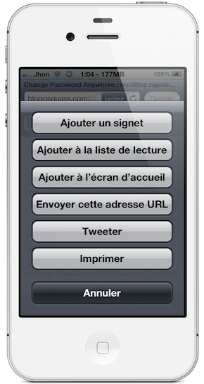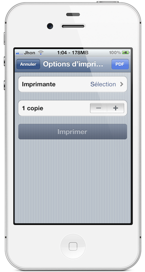 Maintenant, lorsque vous cliquerez sur le bouton pour imprimer (Partager > Imprimer), vous disposerez d’un nouveau bouton « PDF » en haut à droit de l’écran. En cliquant sur celui-ci, un nouvel onglet s’ouvrira avec la page convertie au format PDF. Cliquez de nouveau sur partager pour l’imprimer le fichier PDF. Il est également possible de partager ce fichier PDF sur diverses applications comme iBook ou iFile.
