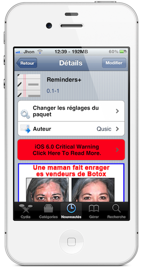Disponible gratuitement sur Cydia sur la source BigBoss, le tweak Reminders+ permettra en effet d’afficher les rappels sur le LockScreen de votre iDevice et ainsi les avoir régulièrement sous les yeux. Une fois le tweak Reminders+ installé, il n’y a pas de nouvelle icône ajoutée sur votre Springboard, ni d’option pour le configurer dans les réglages de votre iDevice. Il faudra malheureusement le désinstaller sur Cydia pour qu’il cesse de fonctionner.