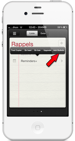 Avec Reminder+, pour ajouter un rappel sur votre LockScreen, il vous suffira de maintenir votre doigt sur la note dans l’application Rappel et de cliquer sur « Add Bulletin ». La note s’affichera directement sur le LockScreen de votre iDevice sous forme d’une notification. Mais il ne sera pas possible de glisser l’icône vers la droite pour afficher le rappel dans l’application, dommage. Il est possible d’ajouter autant de rappels que vous voulez sur votre LockScreen.