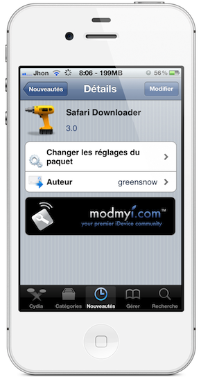 Disponible gratuitement sur Cydia sur la source ModMyi.com, le tweak Safari Downloader permet en effet de télécharger des fichiers depuis Safari sur votre iDevice et de pouvoir les récupérer en SSH ou les utiliser directement sur l’appareil (comme un fichier .deb par exemple).