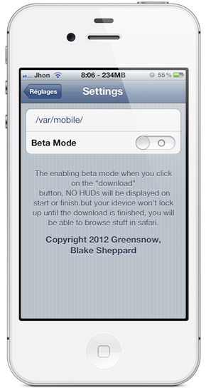 Une fois celui-ci installé, il n’y a pas de nouvelle icône ajoutée sur votre Springboard et les options pour le configurer sont disponibles dans les réglages de votre iDevice. Ces options permettent de choisir un dossier de destination (qui est par défaut sur var/mobile) et d’activer ou non le mode « beta » (qui n’affichera aucune PopUp avant le lancement du téléchargement).