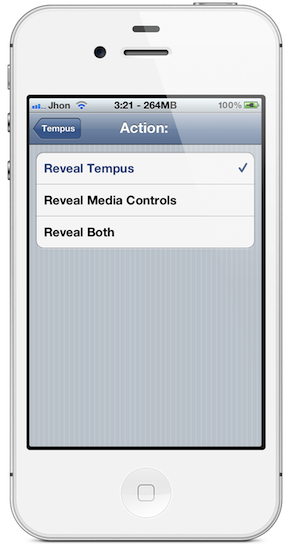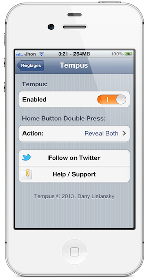 Une fois celui-ci installé, il n’y a pas de nouvelle icône ajoutée sur le LockScreen. Les options pour le configurer sont disponibles dans les réglages de votre iDevice. Sur les réglages du tweak Tempus, vous pourrez simplement choisir ce qui s’affichera lorsque vous cliquerez deux fois sur le bouton « Home » de votre iDevice (sur le LockScreen).