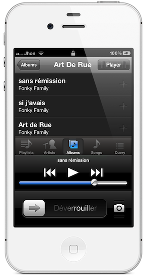 Il est possible d’afficher l’interface complète de lecture en glissant votre doigt de la droite vers la gauche ou en cliquant sur le bouton « Player ». Sur cette interface, vous pourrez visualiser l’illustration de l’album, les paroles (lyrics) s’il y en a, la barre de progression et les informations sur la chanson. En cliquant sur le nom du tweak sur cette interface, il sera même possible de partager la chanson en cours de lecture sur Twitter ou Facebook.