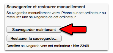 – Pensez bien à sauvegarder le contenu de votre appareil sur iTunes pour ne pas perdre de données lors de la restauration ou du downgrade. Pour cela rendez vous dans l’onglet de votre appareil sur iTunes et cliquez simplement sur « Sauvegarder… ».
