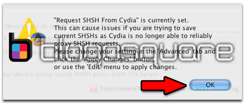 Fermez le premier message (en cliquant sur « Ok ») qui vous signale que la case « Request shsh from Cydia » est cochée (case qui n’est d’aucune utilité pour ce tutoriel).