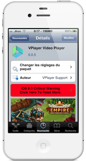 VPlayer est une application Cydia qui vous permettra de lire des vidéos sous de nombreux formats comme AVI, MOV, FLV ou MKV et offre des commandes de volume, de luminosité ou de gestion de taille de vidéo réellement pratiques.