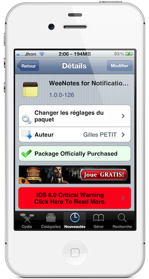WeeNotes for NotificationCenter est basé sur Notes for LockInfo, donc si vous aviez déjà acheté la version pour LockInfo, n’hésitez pas à contacter le développeur. Celui-ci vous fournira gratuitement cette version pour le centre de notification.
